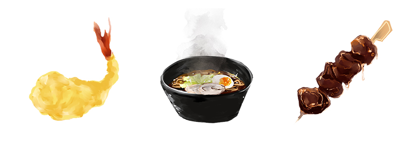 Tempura : Friture très légère et aérienne à base de farine, jaune d’œuf et d’eau froide. Tout type de nourriture peut être préparée en tempura, de l’aubergine à la Saint-Jacques, mais ce sont les crevettes le plus souvent utilisées.